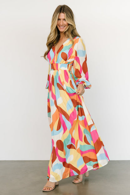 • Vibrant pink, yellow, brown, blue, orange, and ivory print