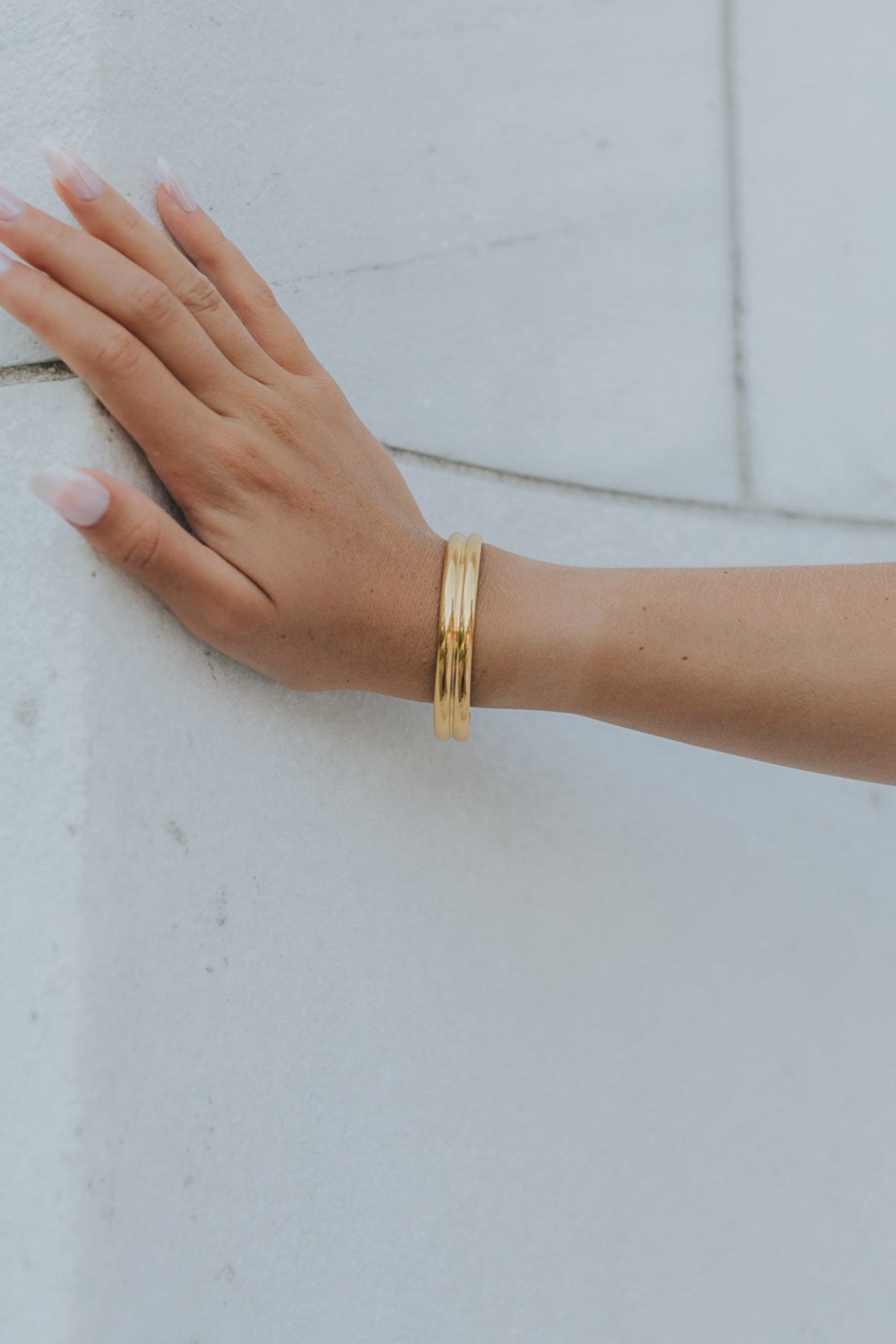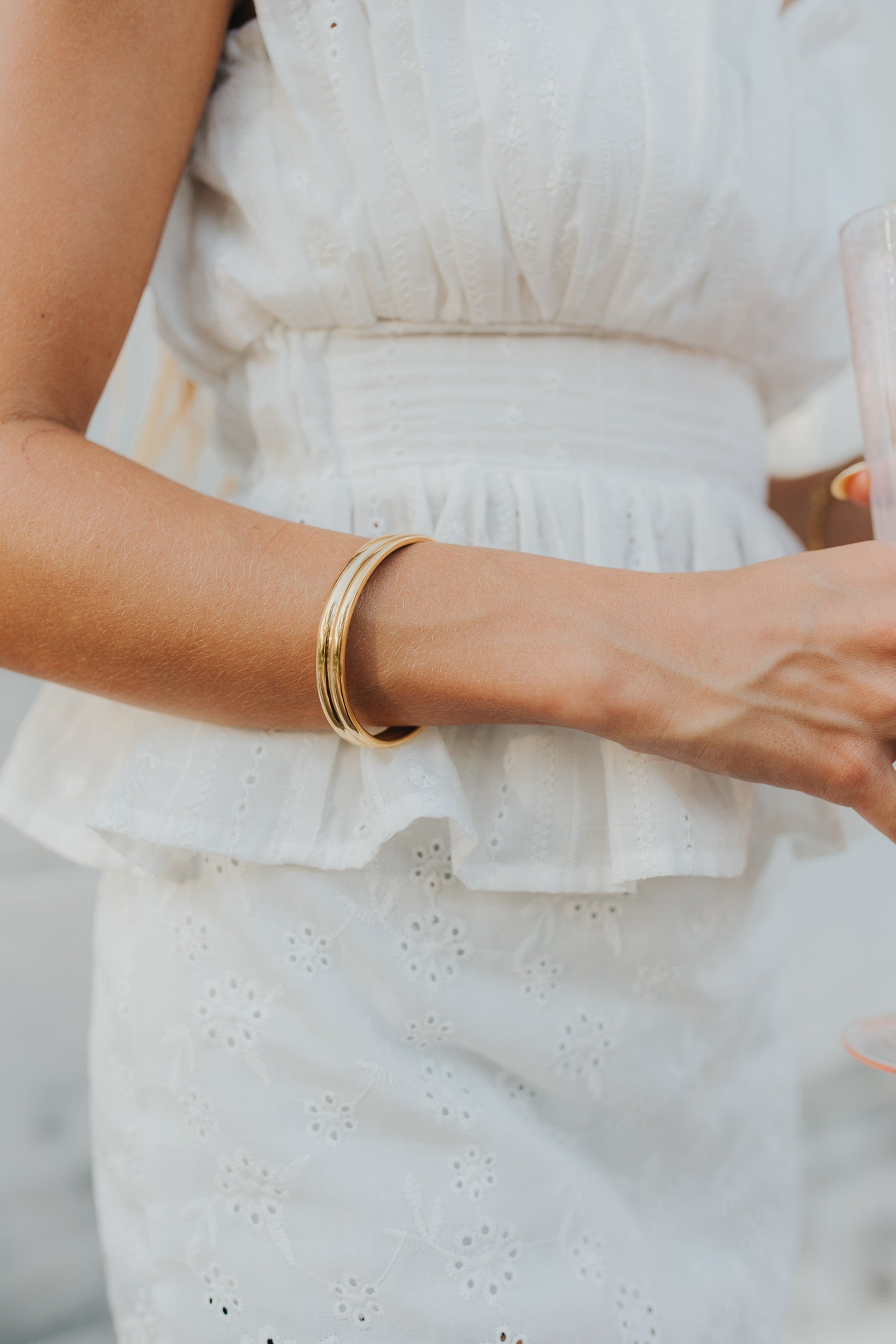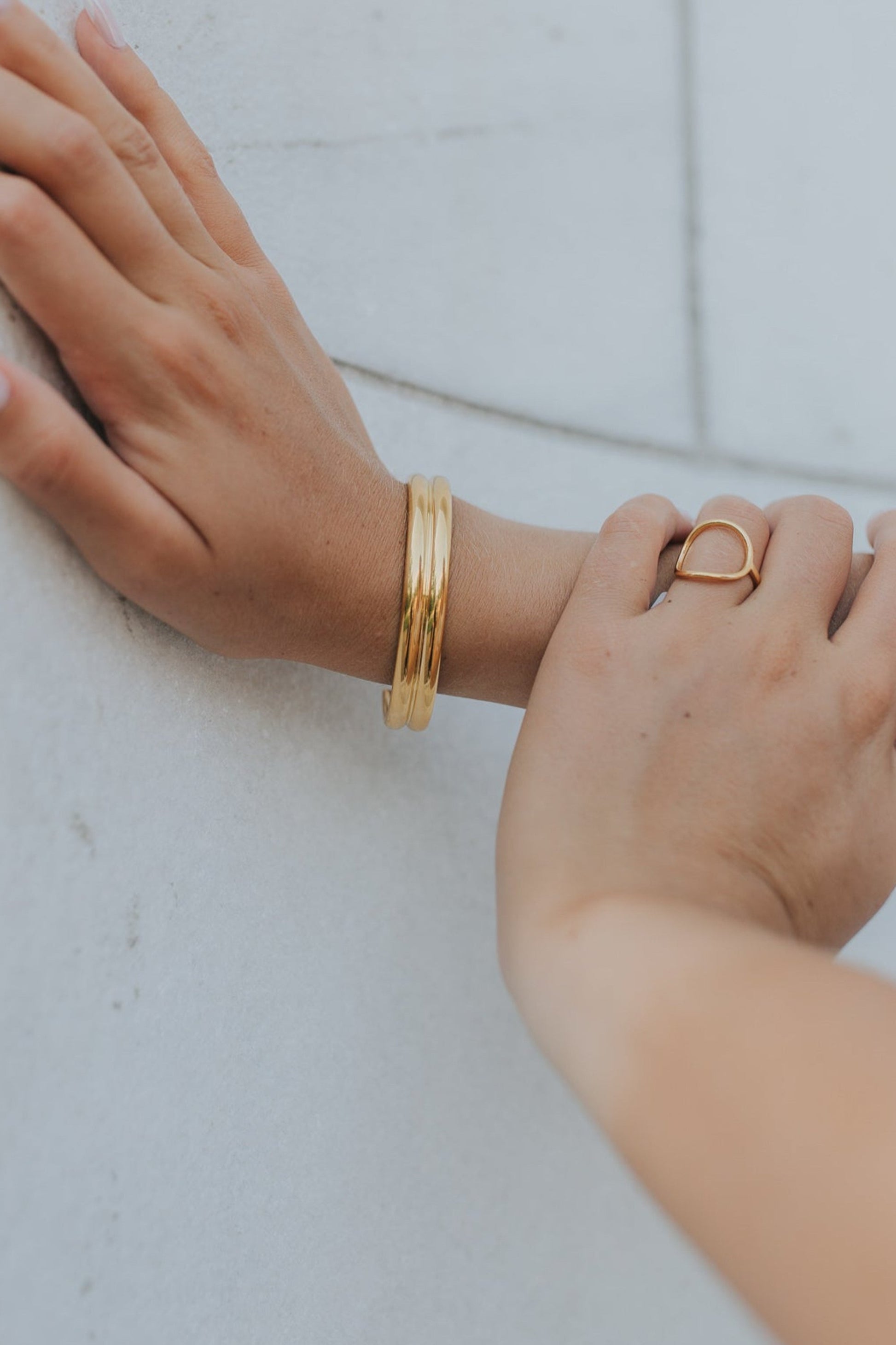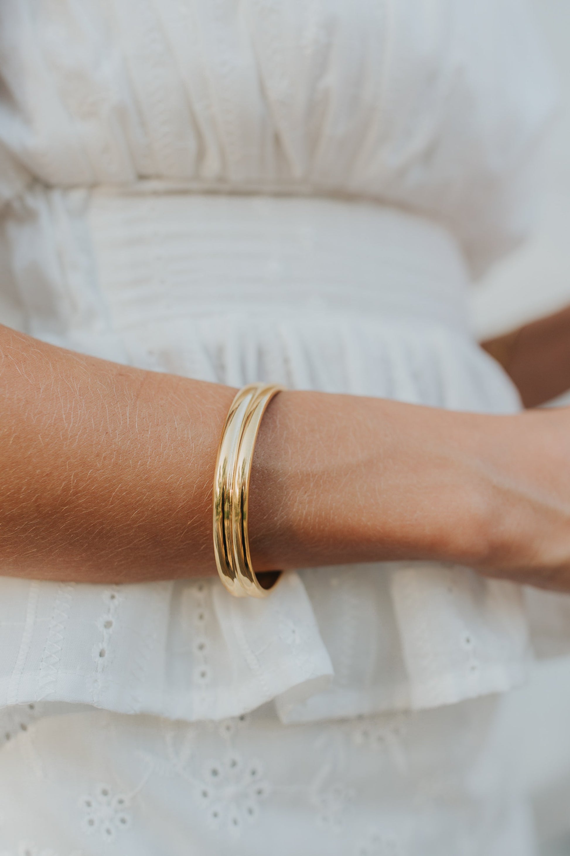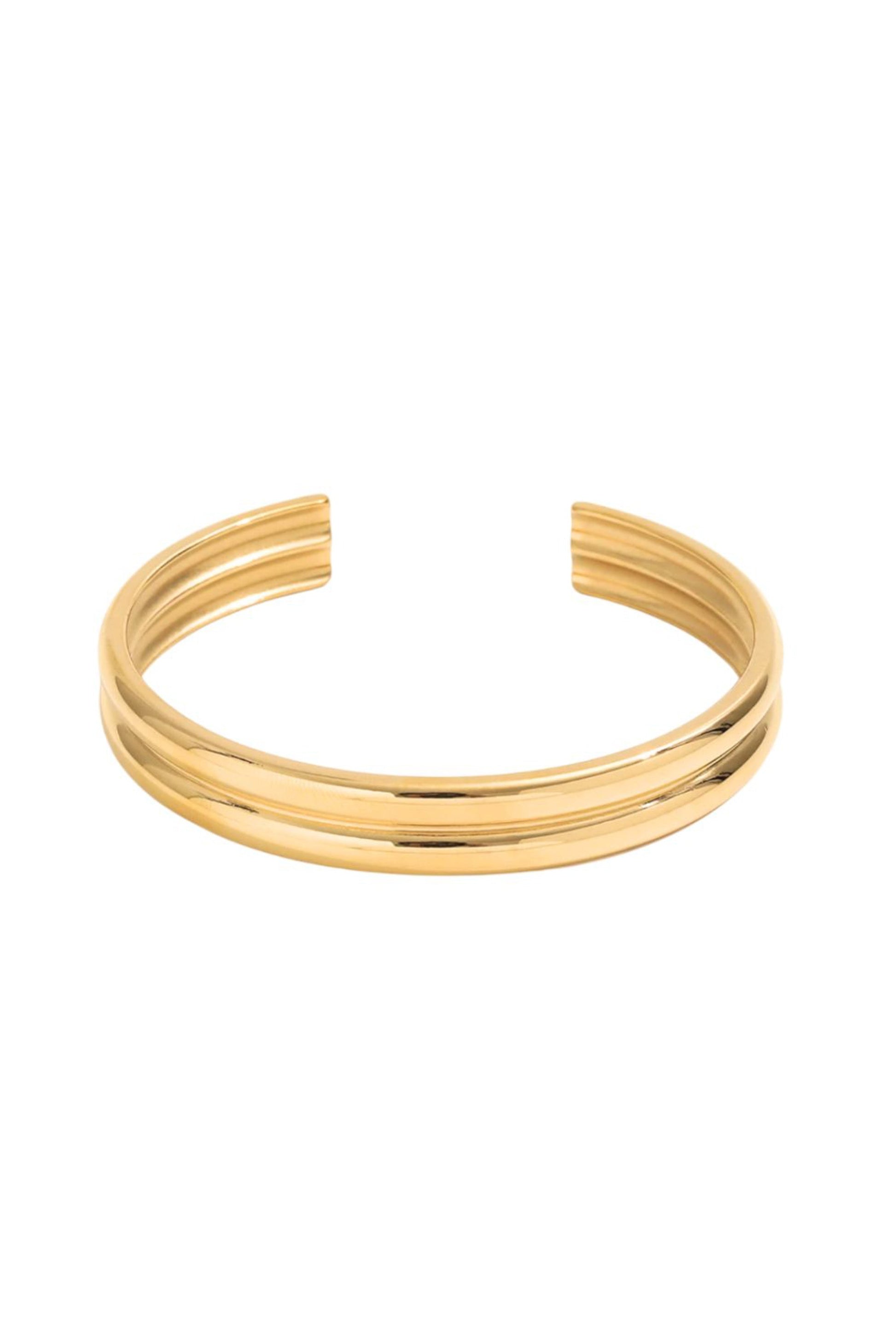 - Open cuff design with dual-bar detail