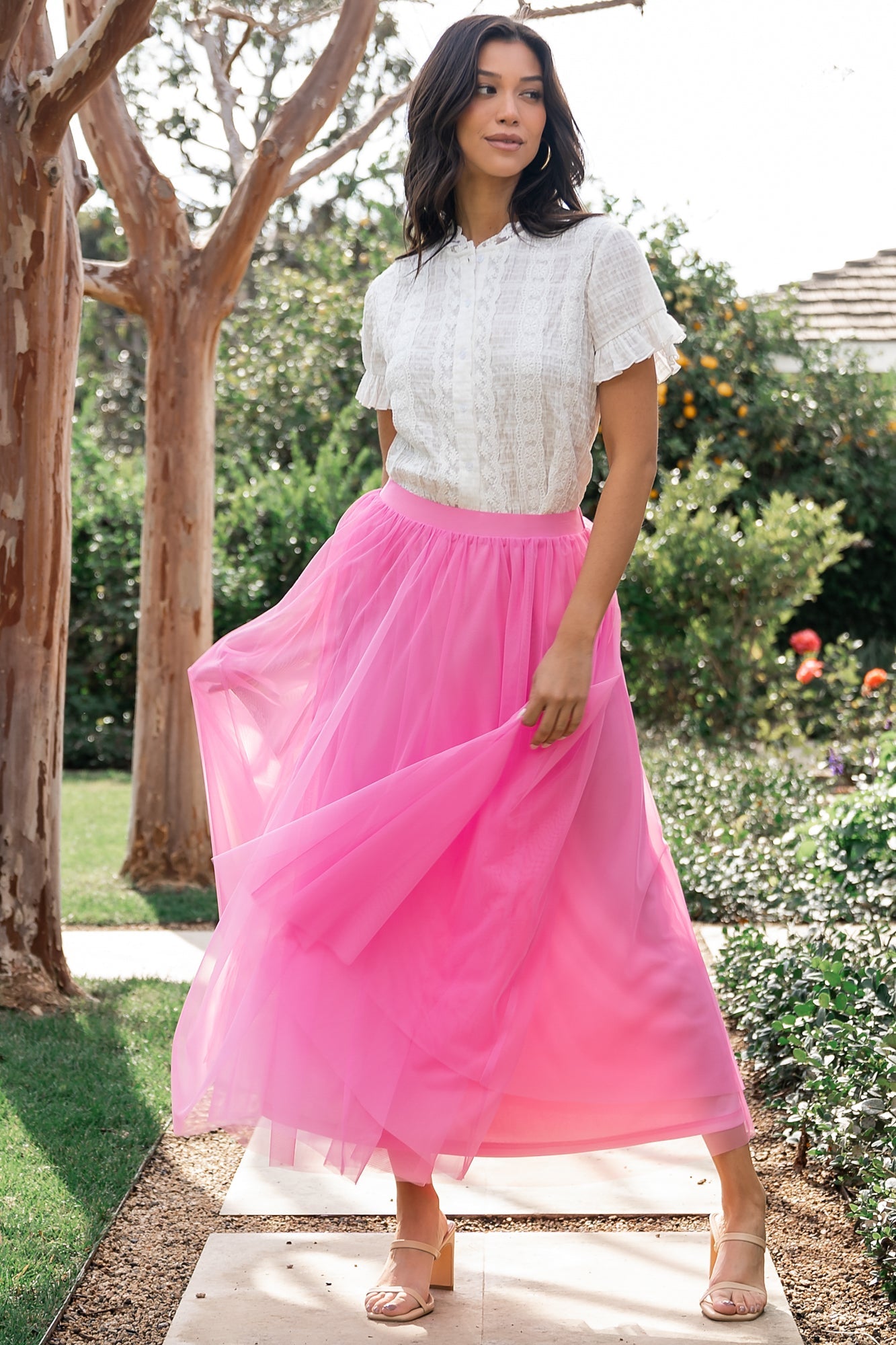 - Paired with our Mila Tulle Skirt in Taffy Pink and our Emmi Mid Rise Wide Leg Jeans in Medium Wash